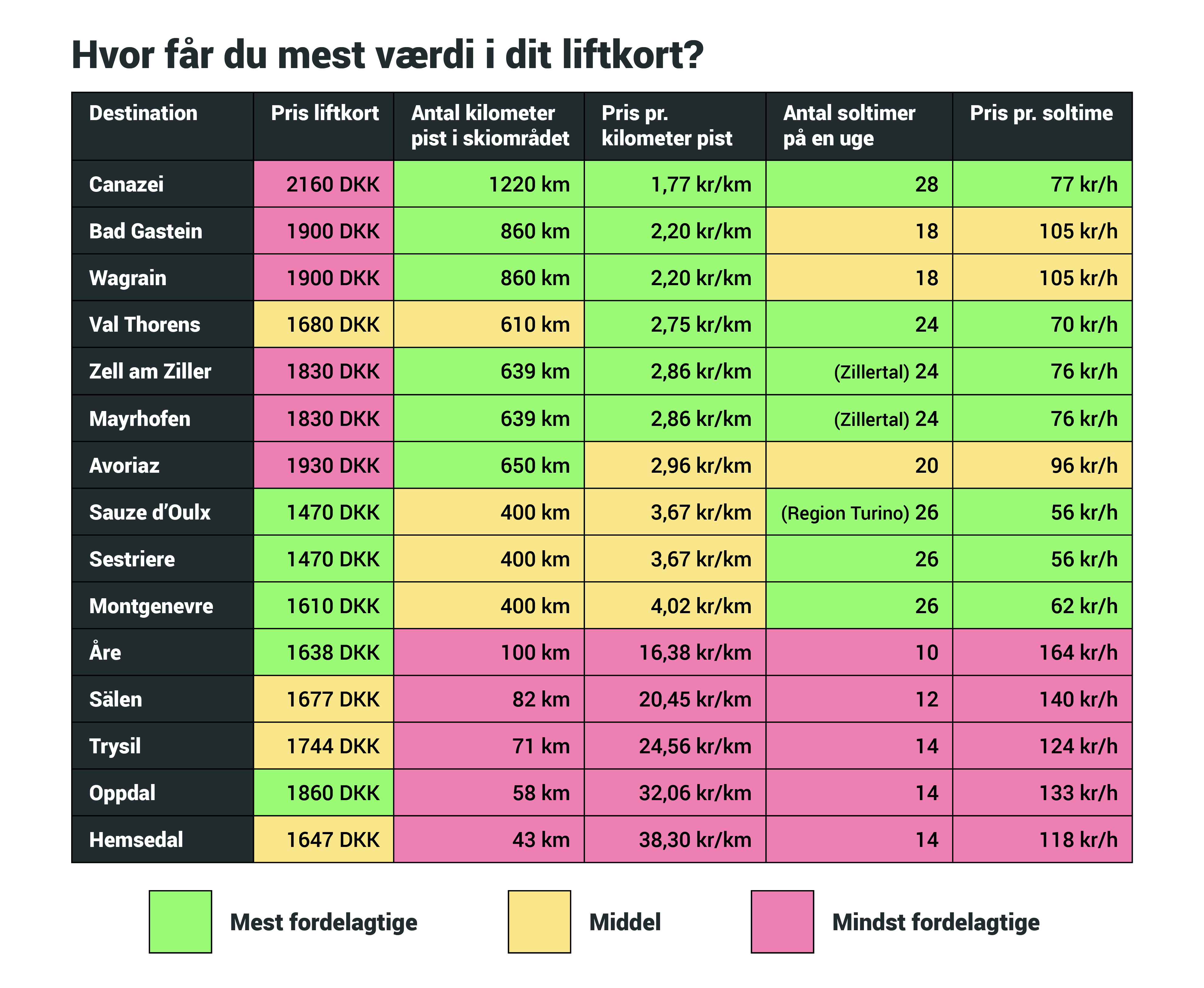 Antallet af solskinstimer er divideret med liftkortets pris baseret på prisoplysninger fra Nortlander og Skistar. Pris per kilometer pist i liftkort udregnes ved at dividere liftkortets pris med antallet af kilometer piste, som kortet giver dig adgang til. Denne udregning er baseret på tal fra Nortlander, Skistar, Skiinfo og Skiworld.